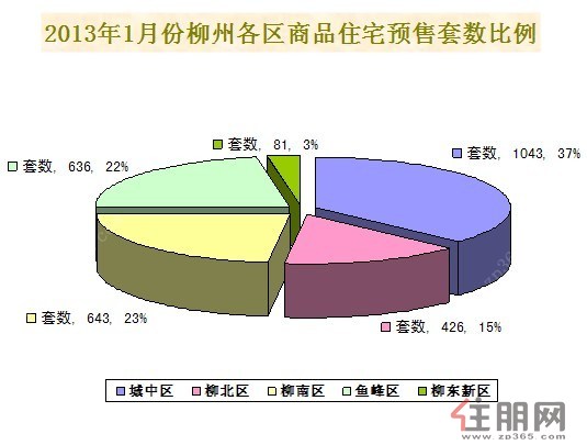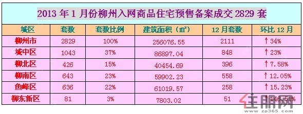 据柳州市房地产交易管理网**数据显示:2013年1月柳州全市新建商品住宅预售备案成交套数为2829套,总成交面积为256076.55平方米,其中,城中区成交1043套,成交面积86897.04平方米;柳北区成交426套,成交面积为40454.69平方米;柳南区成交643套,成交面积59902.23平方米;鱼峰区成交636套,成交面积为61019.57平方米;柳东新区成交81套,成交面积为7803.02平方米。