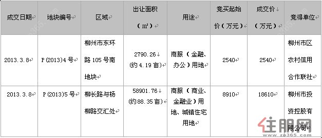 3月8日,柳州市2013年第4期和2013年第5期国有建设用地使用权交易会同时在柳州市土地交易储备中心举行。当天共挂牌出让五宗地块,其中工业用地3宗,住宅用地一宗,商业用地一宗,均成功出让。其中P(2013)5号地块由柳州市投资控股有限公司以1.861亿元成功竞得,P(2013)4号地块由柳州市区农村信用合作联社以底价成功竞得。