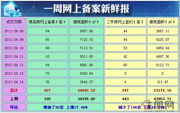 据柳州房产交易管理网数据,2013年4月8日-4月14日,全柳州市商品房网上合同备案共427套,建筑面积:44845.52平方米,相比上周增加92套,环比上涨27.46%;各地方调控政策相继出台,二手房市场逐渐转冷,环比上周下降近一半,二手房网上签约247套,建筑面积:23174.16平方米,相比上周减少了196套,下降44.24%。