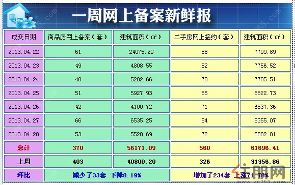 据柳州房产交易管理网数据,2013年4月22日-4月28日,全柳州市商品房网上合同备案共370套,建筑面积:56171.09平方米,相比上周减少33套,环比下降8.19%;继南宁“国五条”细则出台后,本周二手房市场逐渐转冷,但是环比上周仍有所上涨,二手房网上签约560套,建筑面积:61696.41平方米,相比上周增加了234套,下降71.78%。
