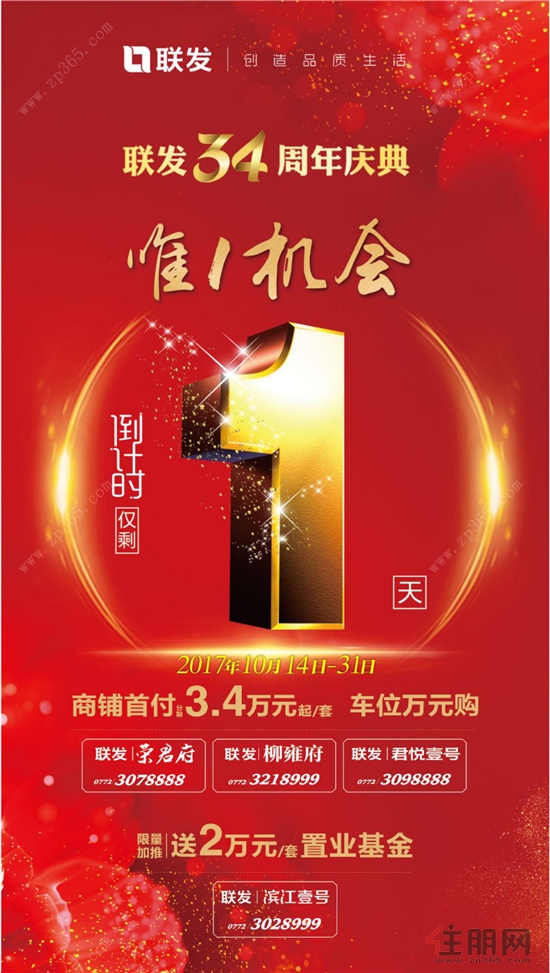 金秋十月,联发集团34周年庆典,为感谢业主的支持,全国16城同步举办首 届不动产内购会回馈业主。柳州联发四盘联动,以品质住宅和优质商铺、车位回馈市民。